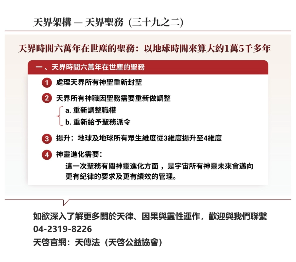 處理天界各教之聖務,並揭示西元二〇二四年至二〇七六年間,地球與地球眾生會改變的各項事宜。