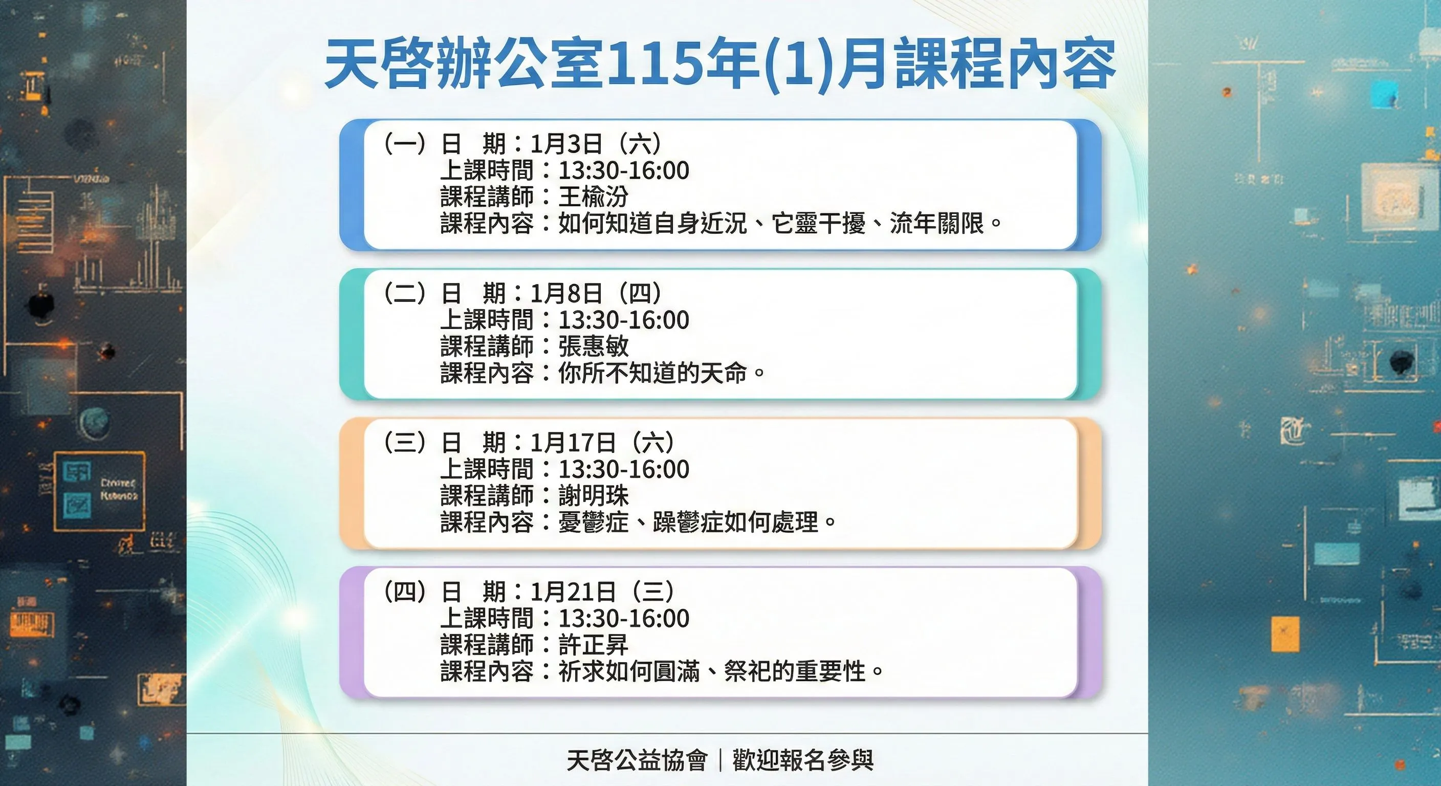 課程內容:如何知道自身近況、它靈干擾、流年關限。